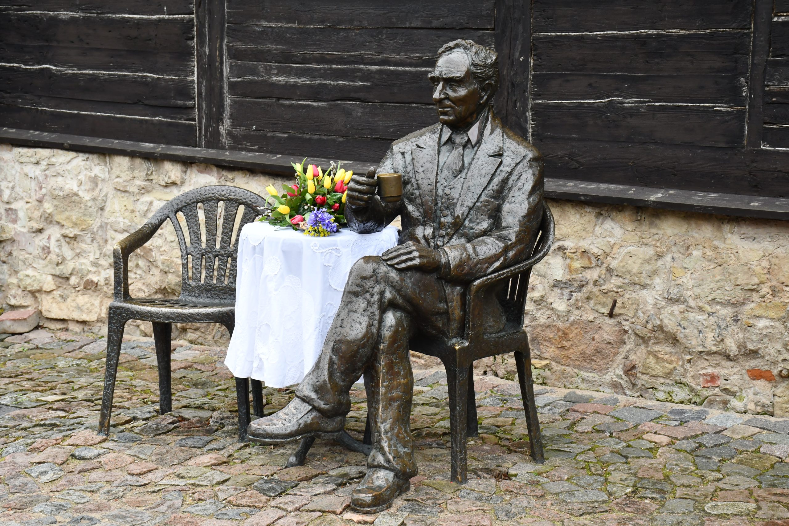 Atceries Kuldīgā zināmo leģendu – ja kāds grib nodzīvot līdz 100 gadiem, tad ir jāapsēžas blakus māksliniekam un jāiedzer tēja.