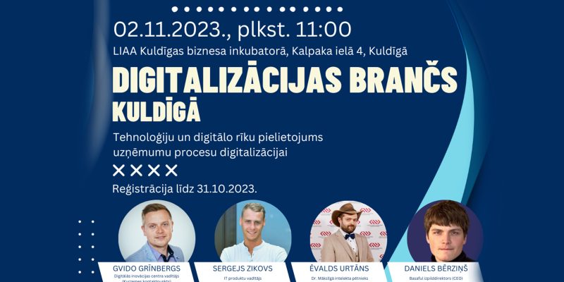 Uzņēmēji un uzņēmumu pārstāvji tiek aicināti uz informatīvo pasākumu “Digitalizācijas Brančs Kuldīgā”, kas norisināsies 2. novembrī no plkst. 11:00 līdz 14:15, Kuldīgā, LIAA Kuldīgas biznesa inkubatorā, Kalpaka ielā 4.