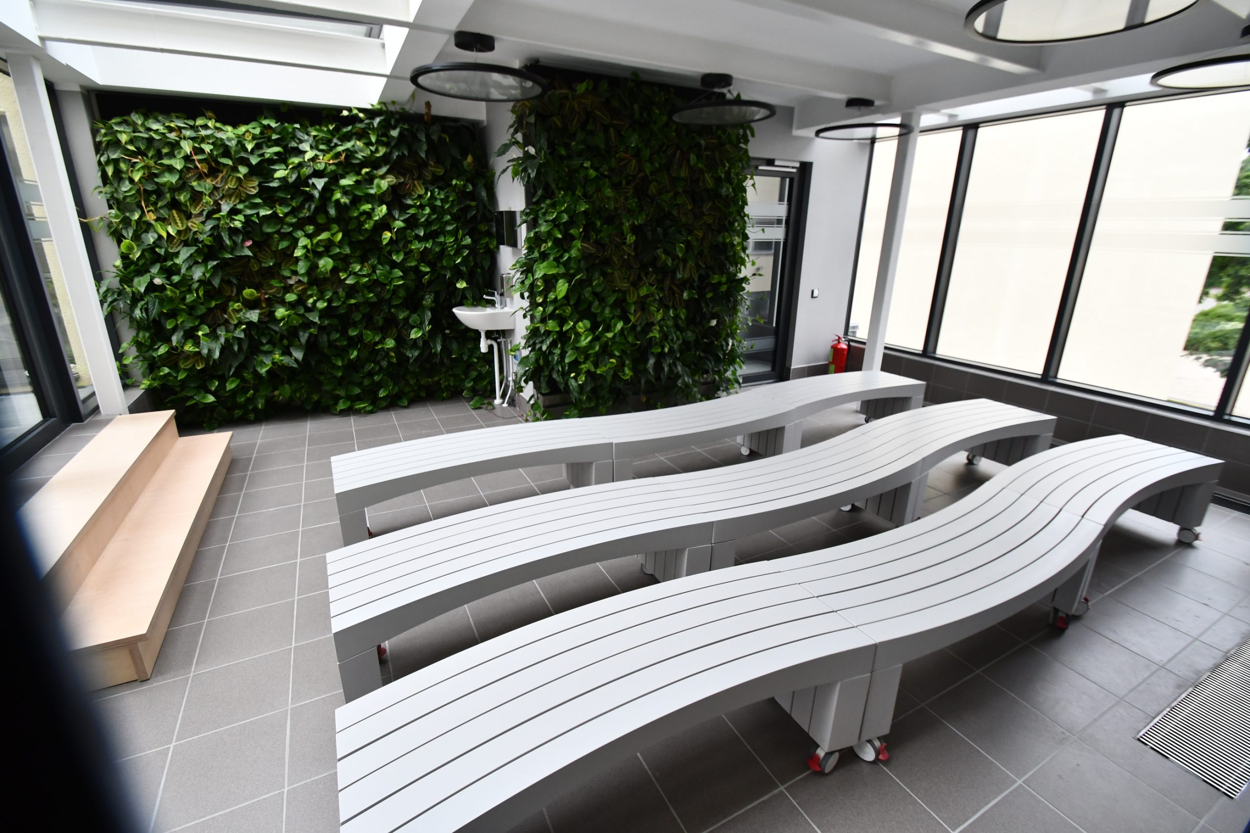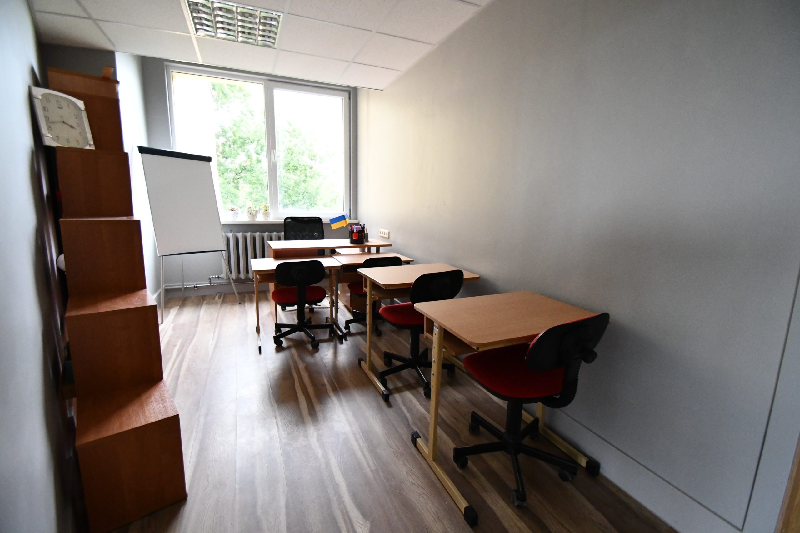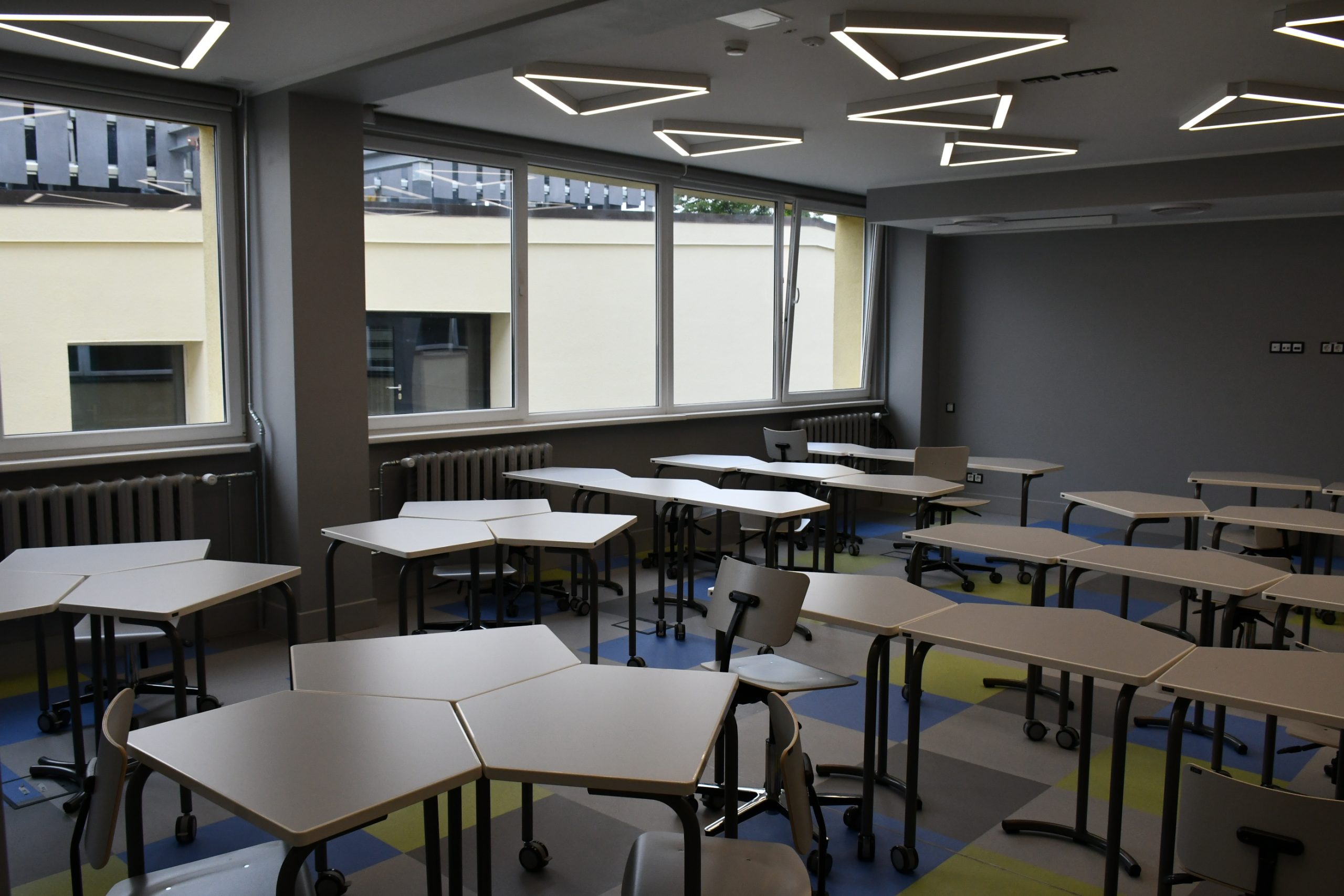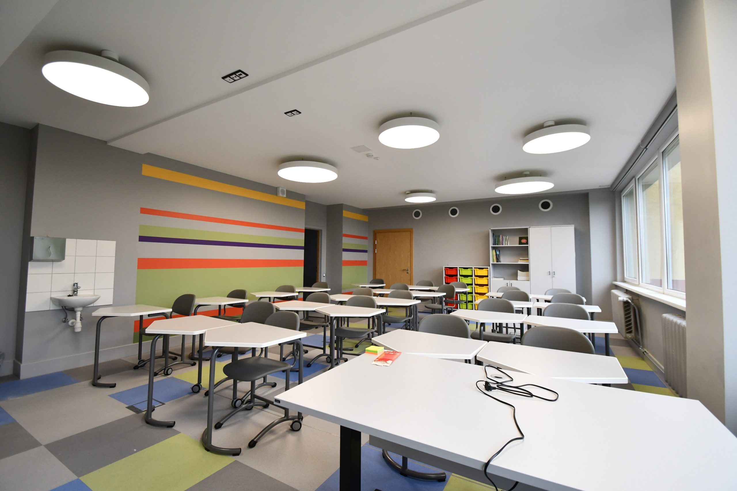 Kuldīgas Centra vidusskola lepojas ne tikai ar skaistu interjeru, bet arī jaunu aprīkojumu – 50 datoriem un 25 planšetēm, ekrāniem stundu sarakstiem un paziņojumiem, TV un interaktīvām tāfelēm, kā arī modernām un ergonomiskām mēbelēm – krēsliem, galdiem, mobiliem plauktiem, kas piemēroti mācību materiālu uzglabāšanai.